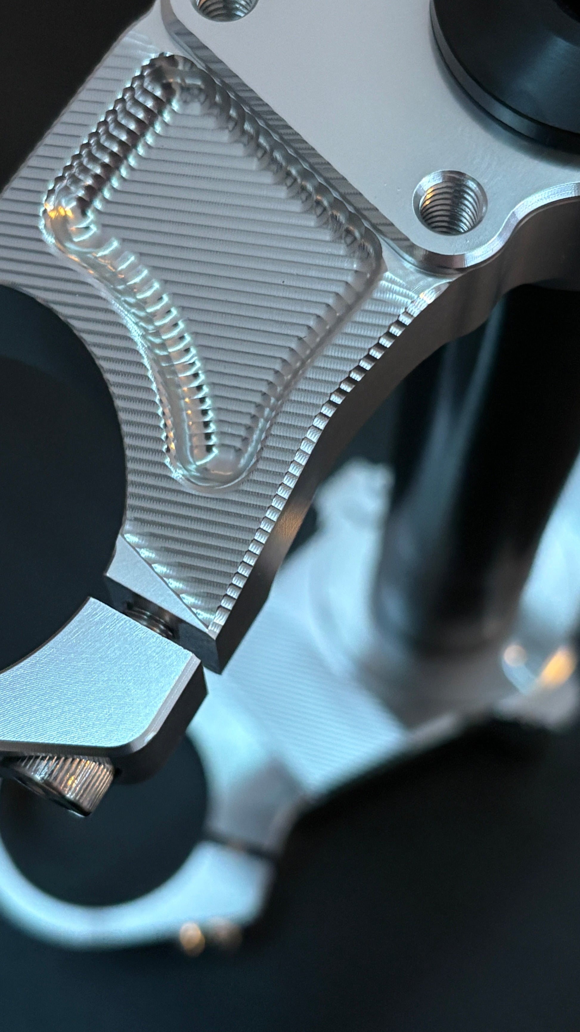 Designed specifically for stock Surron forks (KKE) , this upgrade triple tree isn’t just for looks. It is a mix of billet 6061 and 7075 to provide strength and improve steering angles. This triple tree offers a locking stem system as well a drop geometry giving the front end a taller feel.